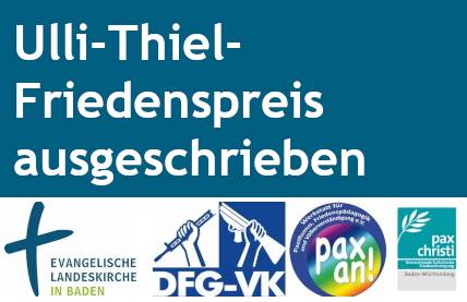 Stuttgart/Karlsruhe, (22.09.2021). Schulen in Baden-Württemberg können sich wieder um den Ulli-Thiel-Friedenspreis bewerben. Einzelpersonen, Klassen, Arbeitsgruppen und Schulen sind aufgerufen, ein freies Friedensthema, das in den Bildungsplänen verankert ist, einzureichen, teilte der Landesverband der Deutschen Friedensgesellschaft - Vereinigte KriegsdienstgegnerInnen (DFG-VK) am Dienstag mit.