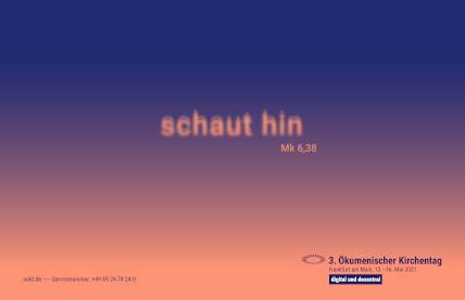Karlsruhe/Freiburg/Mannheim, (06.05.2021). Vom 13. bis 16. Mai 2021 feiern Christinnen und Christen in Baden und ganz Deutschland virtuell den 3. Ökumenischen Kirchentag, der dieses Jahr als digitale Veranstaltung unter dem Leitwort „schaut hin“ steht. Das Programm wird via Livestream unter www.oekt.de aus Frankfurt am Main übertragen. Zusätzlich werden vielerorts dezentrale Veranstaltungen angeboten: entsprechend der aktuell geltenden Corona-Verordnung online oder in Präsenz.