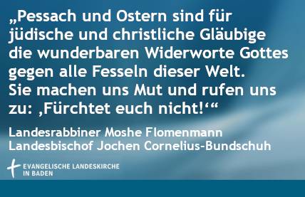 Karlsruhe, (25.03.2021). Erstmals haben sich der Landesrabbiner von Baden, Moshe Flomenmann, und Landesbischof Cornelius-Bundschuh in einem gemeinsamen Gruß zu Pessach und Ostern an die jüdischen und christlichen Gemeinden gewandt.
