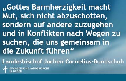 Karlsruhe, (29.12.2020). Der badische Landesbischof Jochen Cornelius-Bundschuh hat in seiner Botschaft zum Jahreswechsel daran erinnert, dass die menschliche Solidarität in Zeiten der Corona-Krise stärker gewesen sei als Ängste und Egoismus. So hätten viele Menschen mit viel Engagement und Kreativität einander geholfen und sich in andere hineinversetzt. Die große Kraft, die dahinterstehe, wurzele in der Barmherzigkeit Gottes, sagte der Landesbischof.