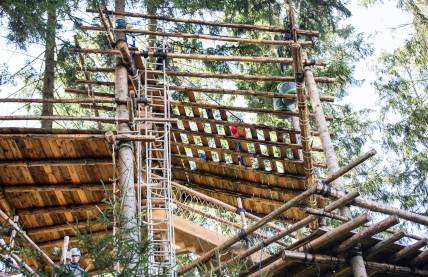 - Dafür genutzt werden ca. 200 Baumstämme (aus dem Wald der Stiftung), ca. 16 km Seil, 25 kg Nägel, 200 m² Bretter